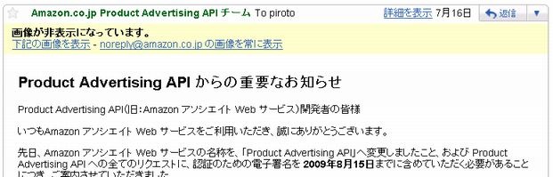Amazon アソシエイト Web サービスの名称が、「Product Advertising API」に変わり、電子署名を 8月15日までにリクエストに含める必要がある旨のメールが先日届いた。