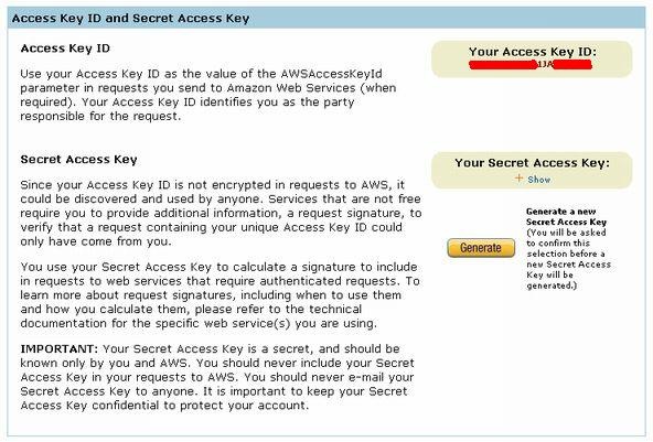 - AWS Access Key ID とAWS Secret Access Keyとがあり、アカウントの取得により、参照可能となる