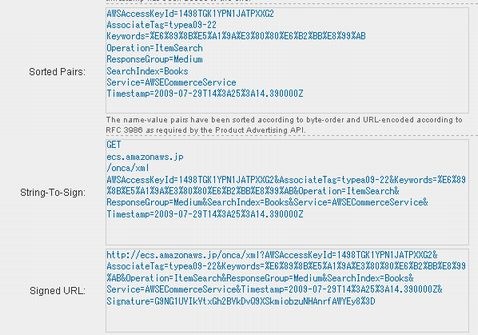 Product Advertising API Signed Requests Helper というツールが提供されており(Web もしくは ダウンロード)、これを確認すると、上記署名の作成手順の途中経過が、順を追って確認できるようになっている。