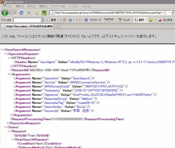 結果が帰ってきた・・・ のはいいけど、どうも、ぱっと見、今回問題としている Secret Access Key が現時点では指定できなさそう?SOAP?これに署名計算を埋め込む???まぁPythonを覚えたいので、Pythonでやってみよう。