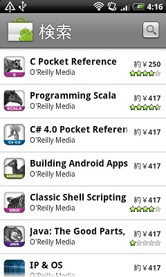 最後に、今、Android Market を確認したら、なくなってしまって(?)いましたが、Android Market にて、O’Reilly の本アプリが、あったので購入しました。