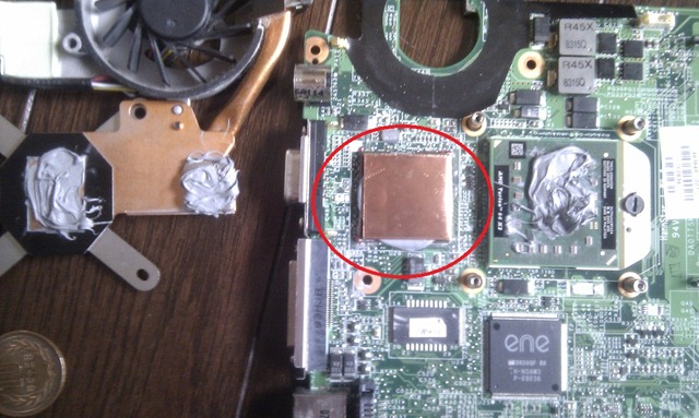 で、グラフィックチップと廃熱カバーの間にグリスと1円玉程度の銅板が挟まれている。