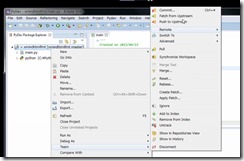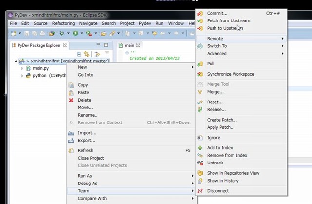 プロジェクトに適当にファイル(今回はmain.py) を追加し、コンテキストメニューから、Team – Commit