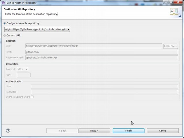 先ほど設定したリモートリポジトリが設定されているので、そのまま進む。