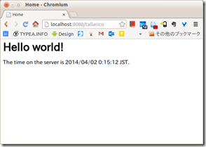 Hello World アプリ(時間を取得して表示する)が構成されているので、Servers ビューのGlassFishを右クリックし、Add and Remove から、Webアプリケーションを追加して、GlassFishを起動する。