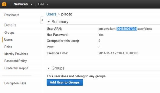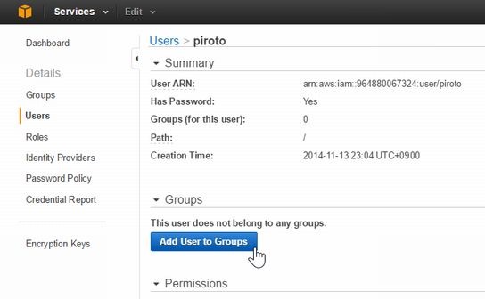 作成出来たユーザーを選択し、Add User to Groups で先ほど作成したAdministratorsグループに追加する