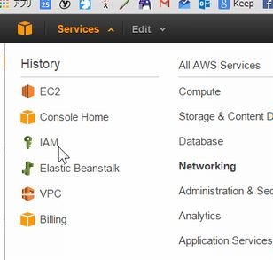 Amazon Web Services コンソールにログインして、ヘッダーメニューから、Sevices を展開すると、IAM メニューがあるので選択する。