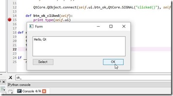 構成に工夫の余地はあるが、Qt Desinger で作成した、UIを利用する Formを宣言することで、見た目と処理コードが分離(ボタンを押下したときの処理を、btn_ok_clicked() に記述し、初期化時にバインド)でき、継続的にUIを変更するサイクルも整った。
