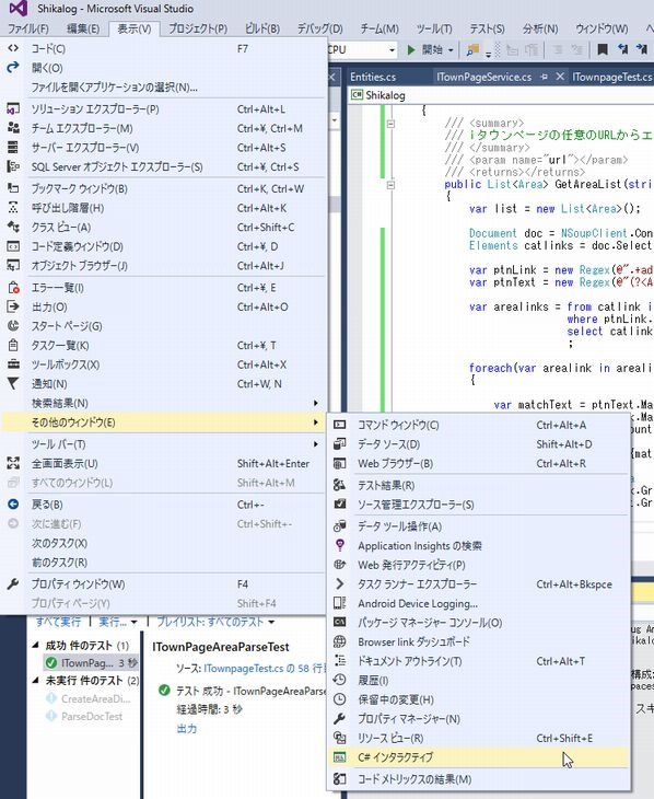 メニュー – 表示 – その他ウィンドウ – C# インタラクティブ