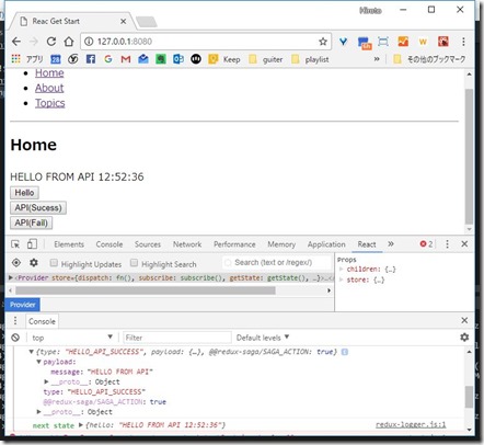 成功ボタンを押下、json取得し、Actionによりstateが更新され、そうていされた結果が表示されたOK。