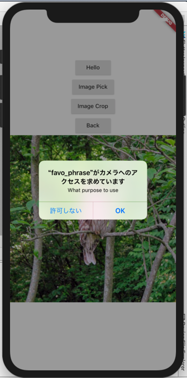 「Image Crop」ボタン押下で、_handleImageCrop() を呼び出し、画像選択 を経由(カメラを起動)して取得したファイル
