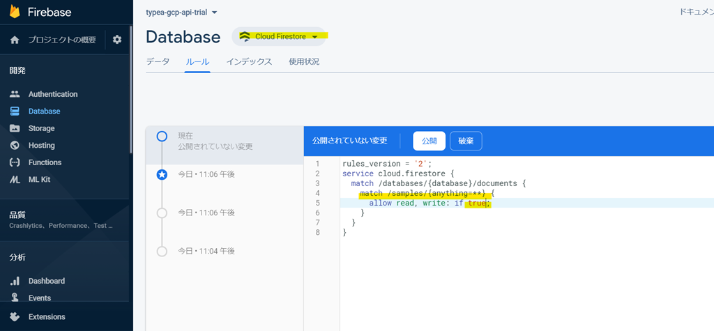 上記でFirestoreを使用するアプリを記述したが、Firebaseのコンソール Database-Cloud Firestore - ルール からアクセスルールを記述する。