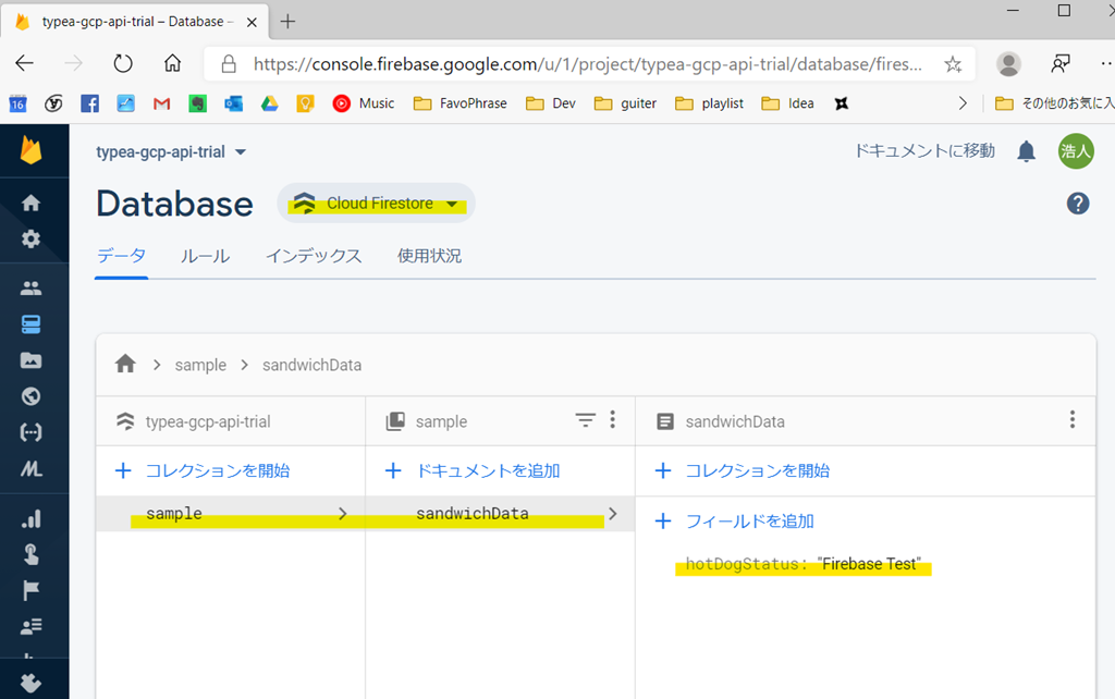 Firebase コンソール Database ー Cloud Firestore で内容を確認すると、先ほど登録した内容が保存されている。