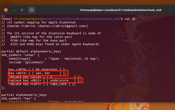 上記で確認した設定ファイル、/usr/share/X11/xkb/symbols/macintosh_vndr/jp をバックアップをとりつつ修正。