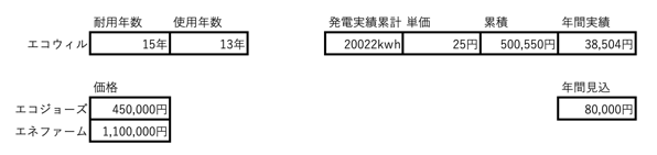 エコウィルも年間4万円程度発電するって聞いてたのに、13年で、38万円 とすると年間3万円やないか。。。