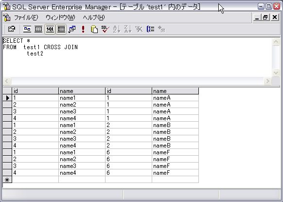 SLECT * FROM test1 , test2 FROM句に、表を (,)で区切ってならべたものと等価。