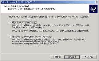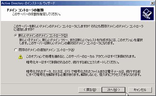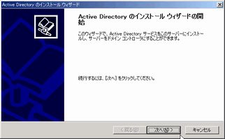 Windows2000 Server インストール直後にこの画面が表示されるのでそこからインストールを開始できる。 「起動時に、この画面を表示する」のチェックをはずしている場合はこの画面は表示されないので、 「管理ツール」-「サーバーの構成」で起動できる。 左側のペインで「Active Directory」をポイントし、「Active Direcotoryウィザードを開始します」をクリックして開始。