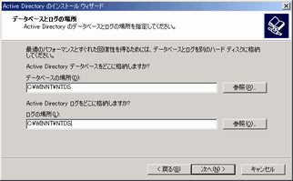 データベースファイル(NTDS.DIT) と、トランザクションログファイル(edb.log)を格納するフォルダを指定。
