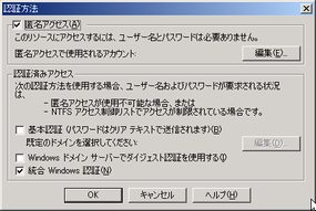 インターネット インフォメーションサービスマネージャ(MMC の IISスナップイン)から 仮想ディレクトリのプロパティを開いて、「ディレクトリ セキュリティ」タブを選択し、 「匿名アクセスおよび認証コントロール」の編集ボタンを押下