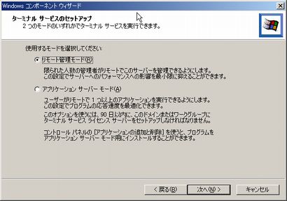 ターミナルサーバには、以下の2つのモードがあるが、同時にサポートされないため 何れか1つを選択する。ここでは、リモート管理モードを選択する。